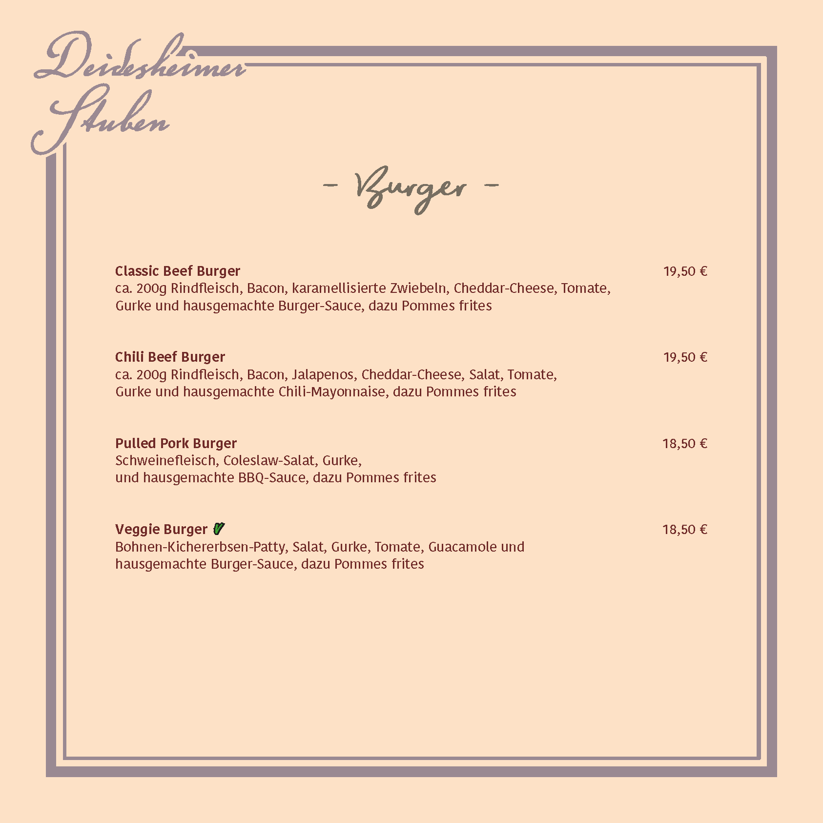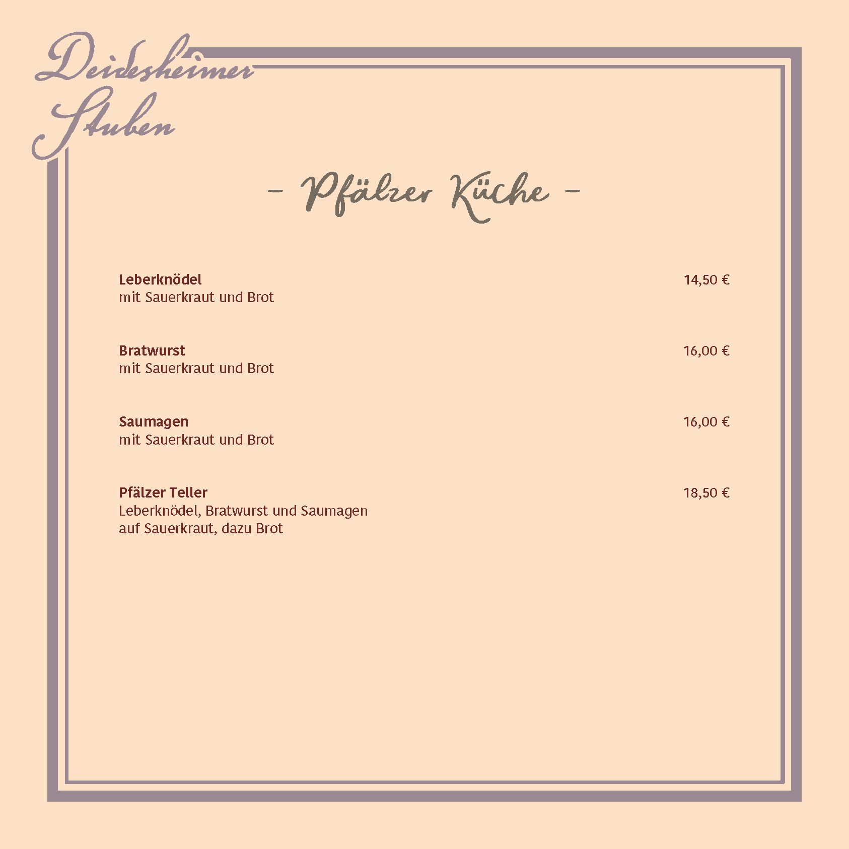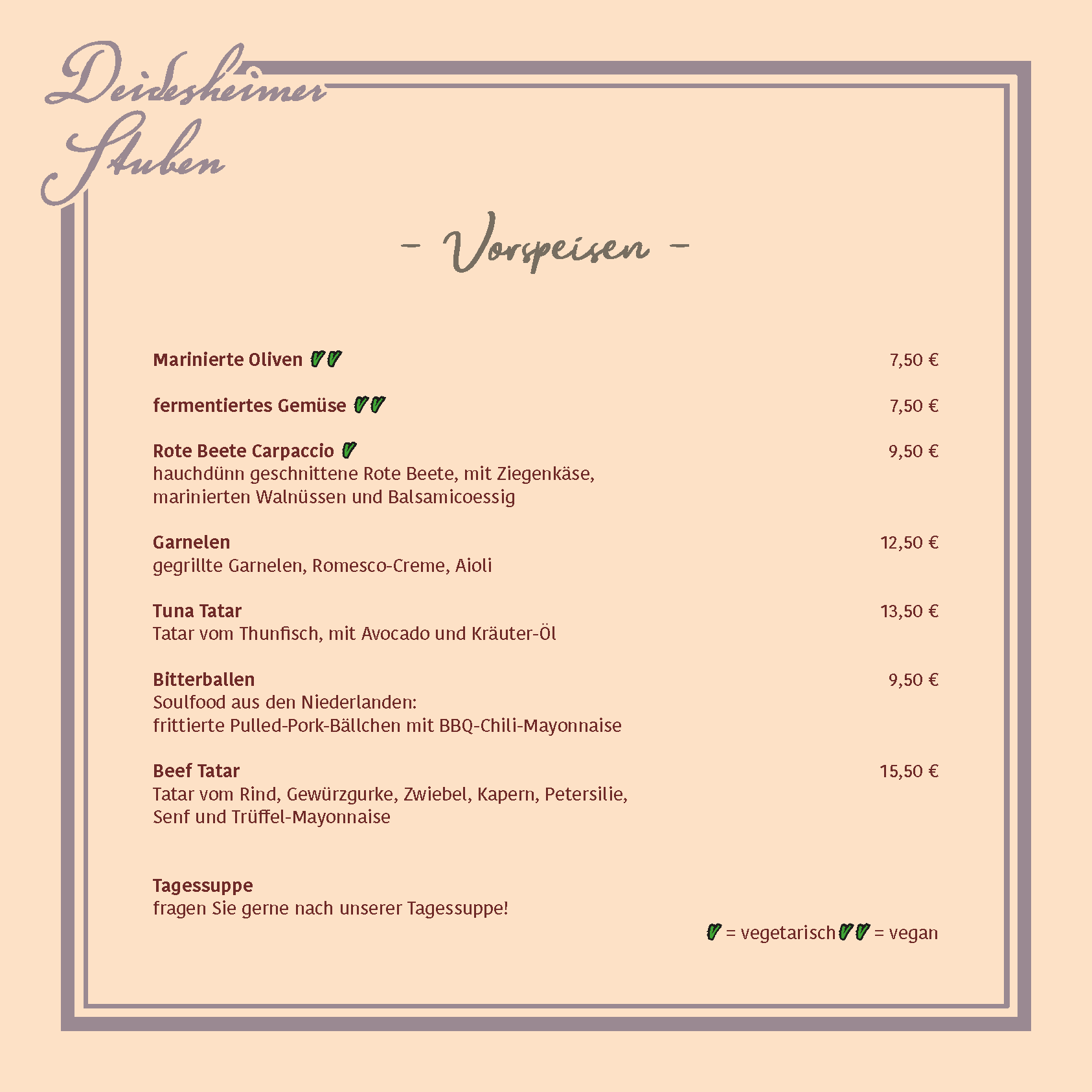 Lassen Sie sich von unserer regional inspirierten Küche und den Schätzen der Deidesheimer Weinkultur verwöhnen! Unsere Speisekarte verbindet Tradition und Moderne und bietet eine vielfältige Auswahl liebevoll zubereiteter Gerichte – von herzhaft über leicht bis vegetarisch, hier ist für jeden Geschmack etwas dabei.