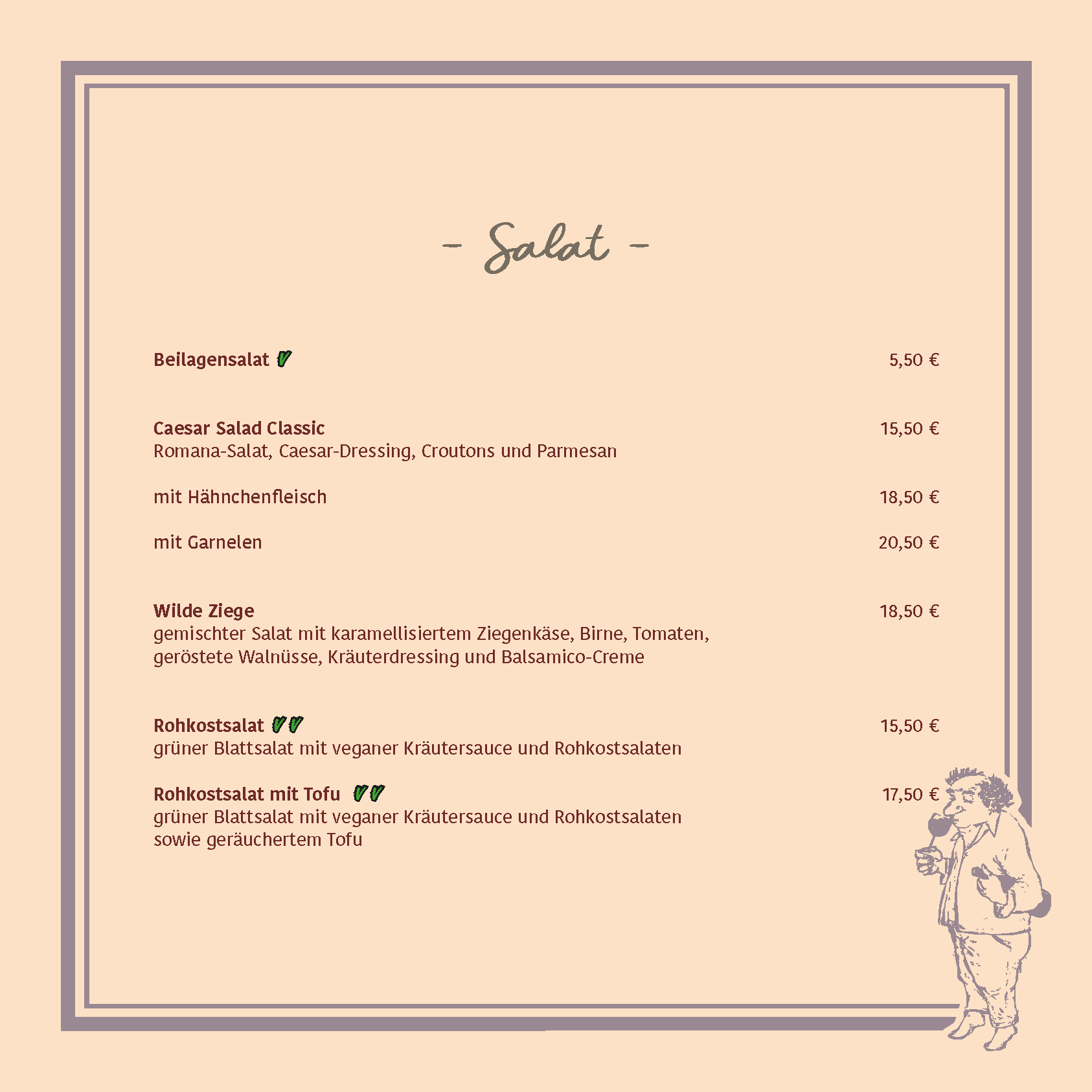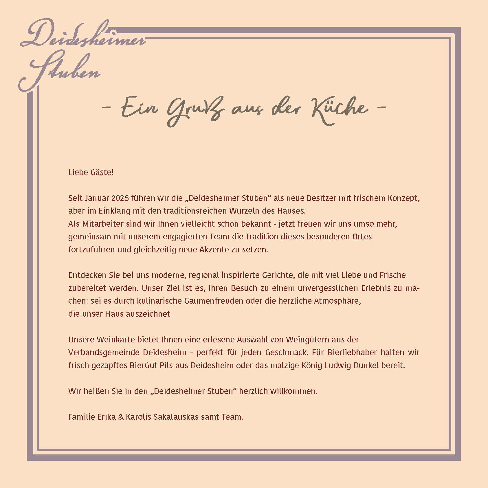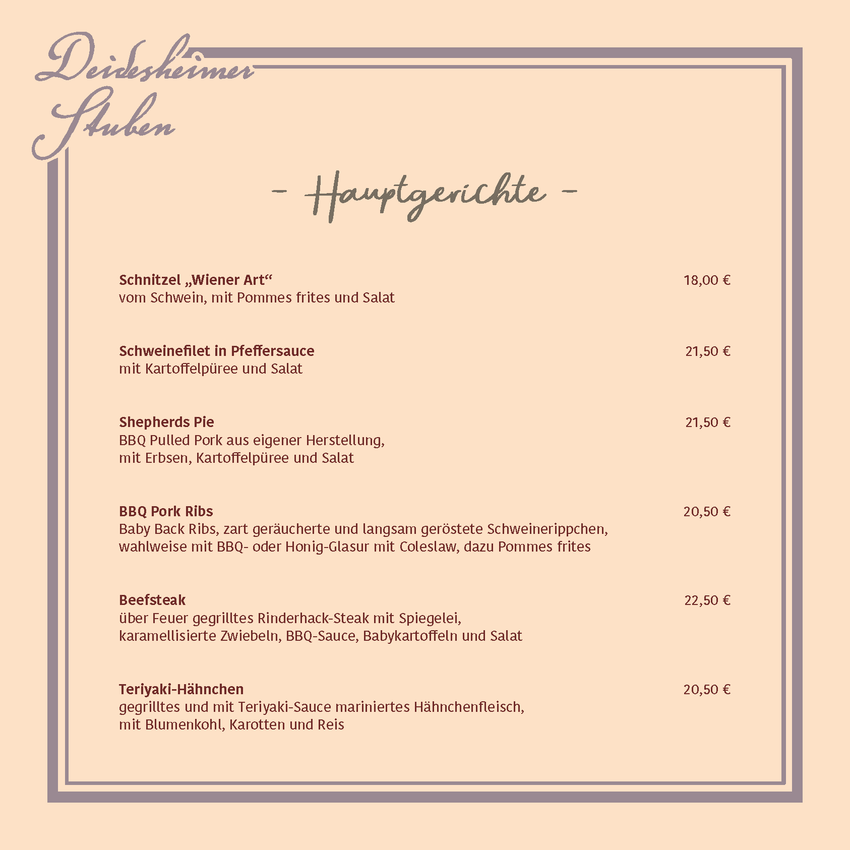 Lassen Sie sich von unserer regional inspirierten Küche und den Schätzen der Deidesheimer Weinkultur verwöhnen! Unsere Speisekarte verbindet Tradition und Moderne und bietet eine vielfältige Auswahl liebevoll zubereiteter Gerichte – von herzhaft über leicht bis vegetarisch, hier ist für jeden Geschmack etwas dabei.