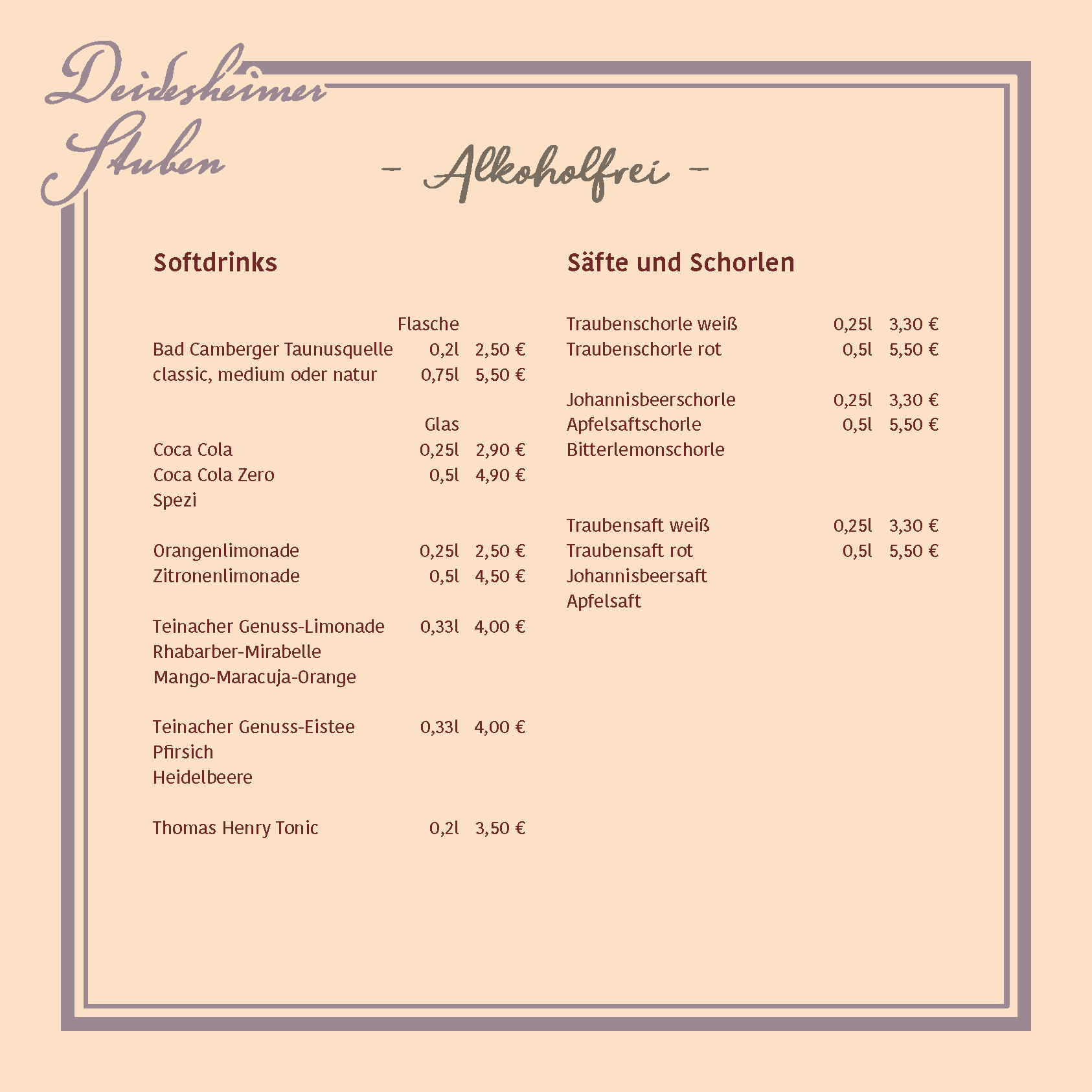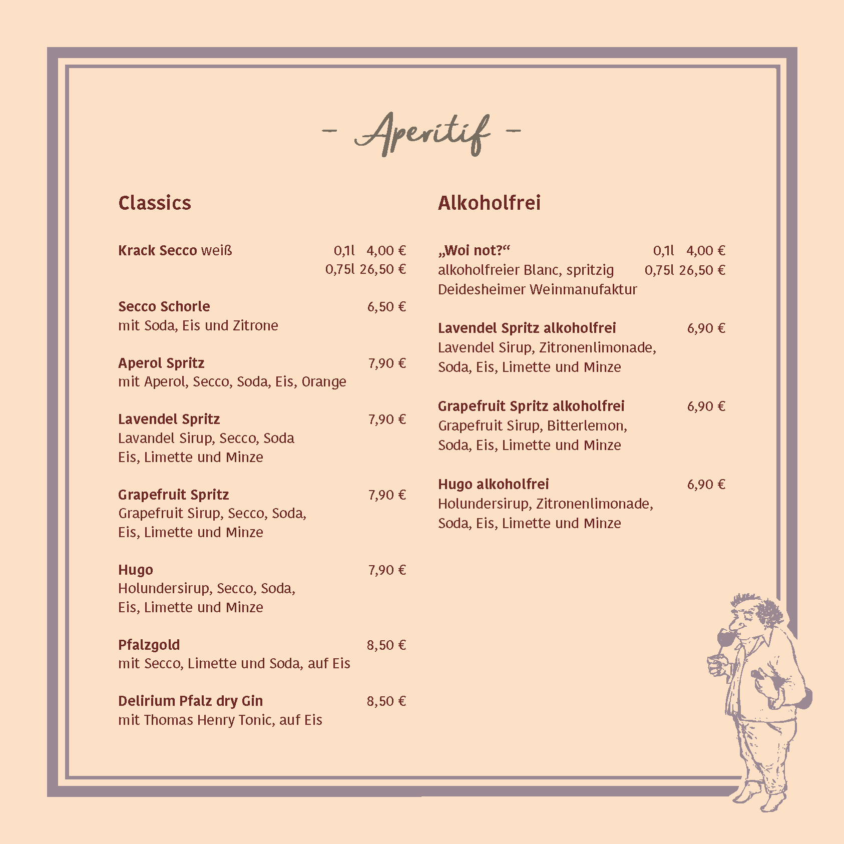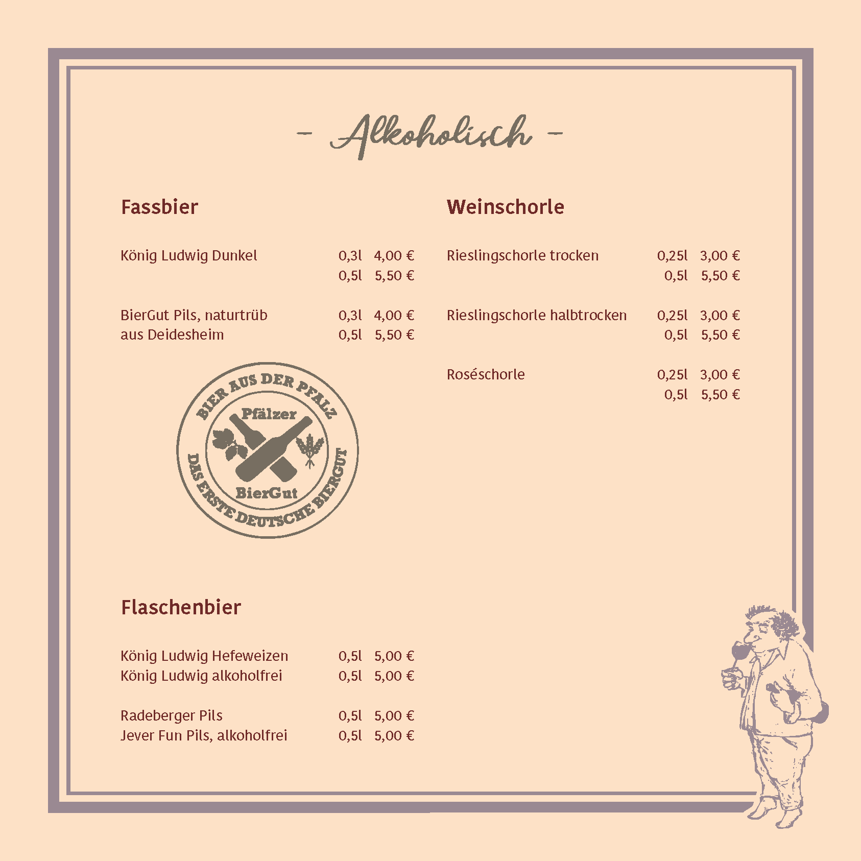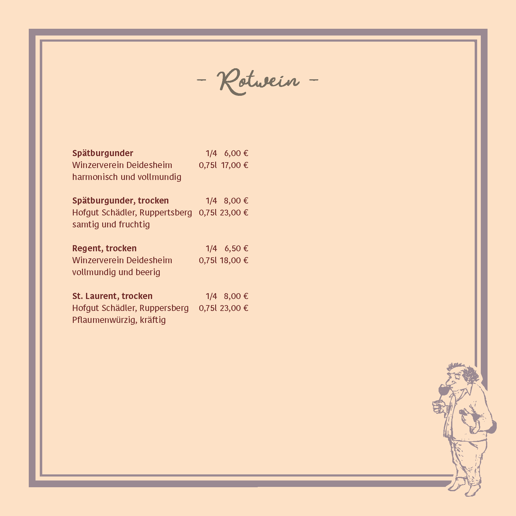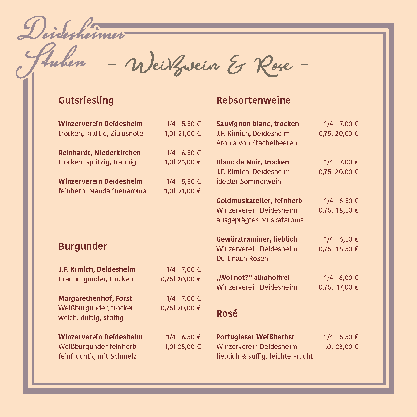 Passend dazu lädt unsere Weinkarte Sie ein, die facettenreiche Welt der regionalen Weine zu entdecken. Genießen Sie erlesene Tropfen von renommierten Weingütern der Verbandsgemeinde Deidesheim. Ob ein edler Riesling, ein vollmundiger Spätburgunder oder ein prickelndes Glas Sekt – bei uns finden Sie immer den idealen Begleiter für Ihr kulinarisches Erlebnis.